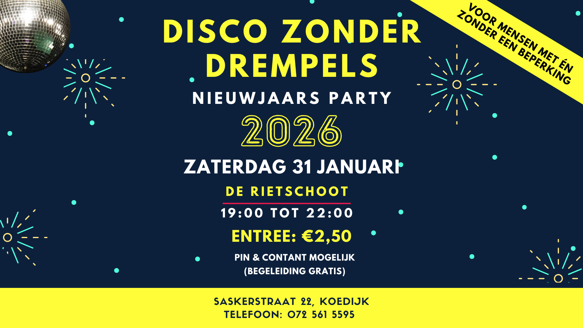 Elke laatste zaterdag van de maand organiseren wij, in samenwerking met Cripple X Entertainment, de ‘Disco Zonder Drempels’ in De Rietschoot. Een feestelijke avond voor mensen met én zonder een beperking. Feest met elkaar het nieuwe jaar in met onze ”New Years Party”!