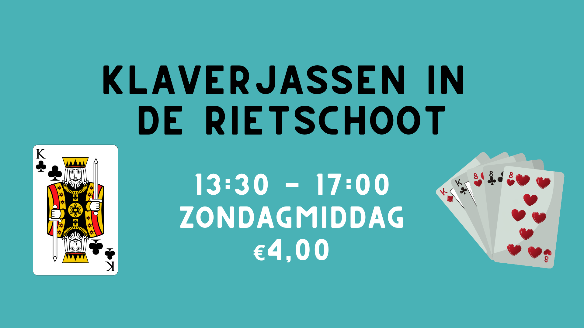 Twee keer in de maand kun je bij De Rietschoot terecht voor een gezellige zondagmiddag klaverjassen. Deze middag is een leuke manier om sociale contacten te leggen. Elke deelnemer speelt voor zichzelf en niet met het mes op tafel. Er zijn leuke prijsjes te winnen, zelfs een poedelprijs. De entree is inclusief een kopje koffie/thee en een bitterbal. Maximum aantal deelnemers is 60 personen.